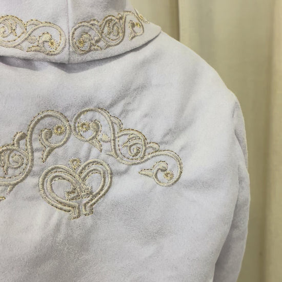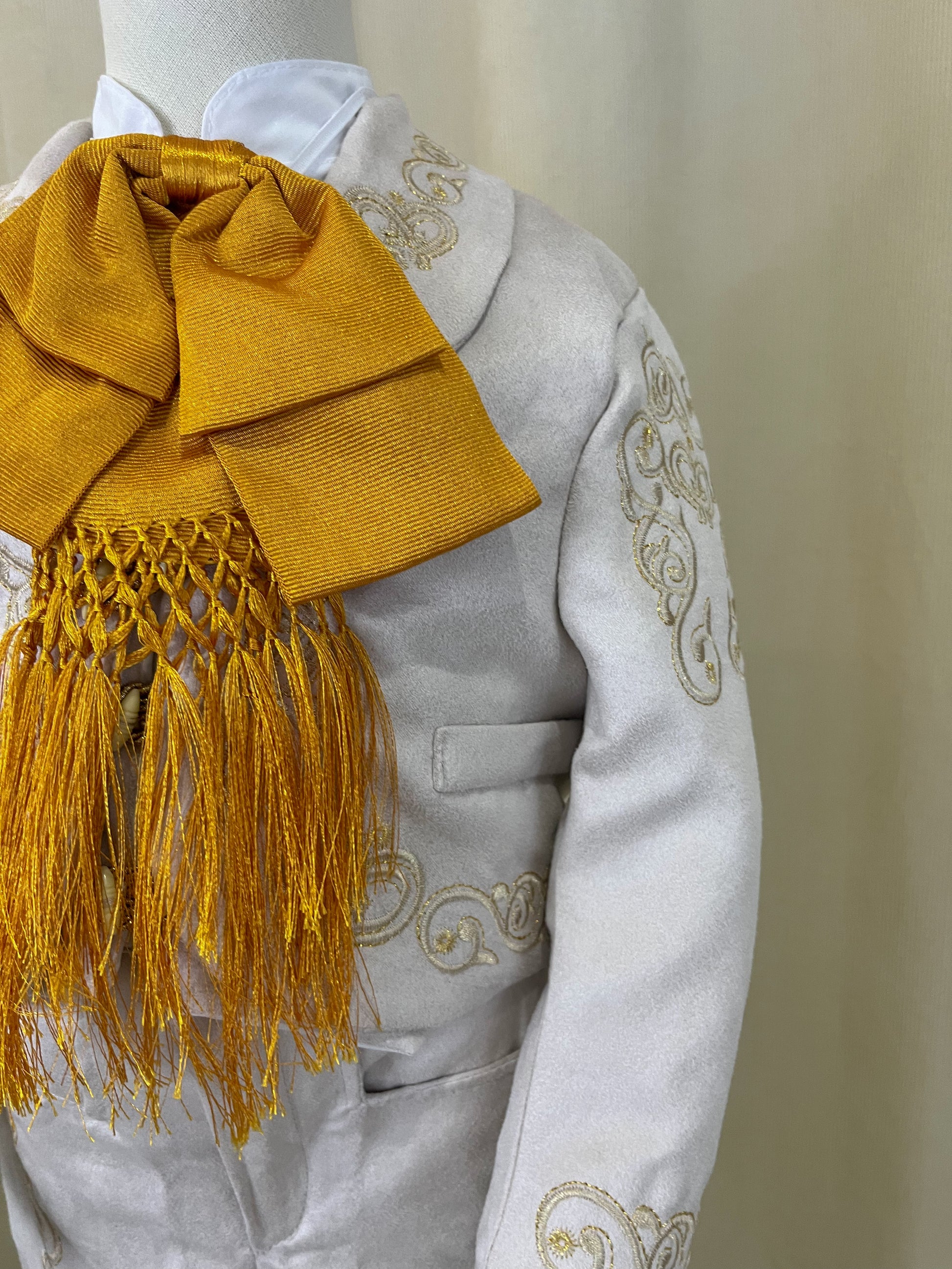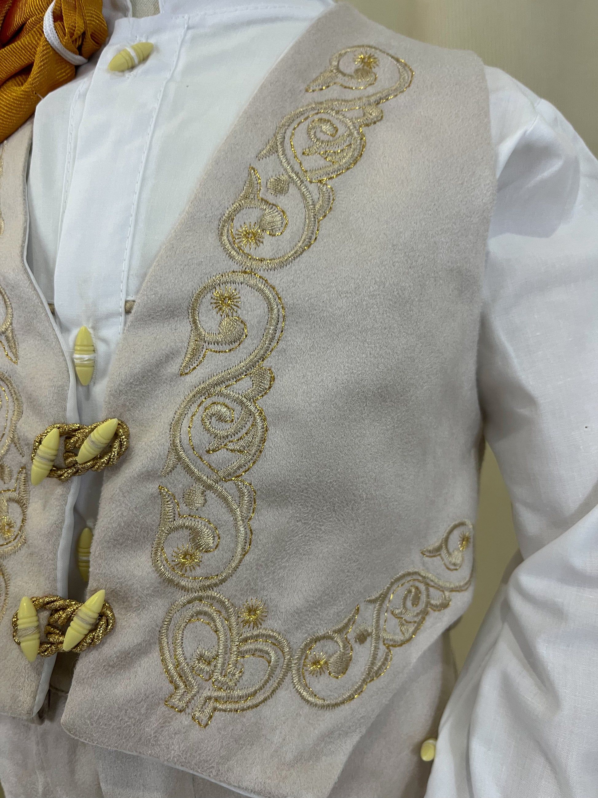 Incluye: camisa manga larga, pantalon ajustable bordado, chaleco bordado, saco bordado, moño y sombrero (opcional).