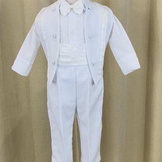 Viste a tu pequeño con elegancia con nuestro traje con brocado que lo hace lucir elegante y sofisticado. El cual cuenta con 5 piezas las cuales incluyen: