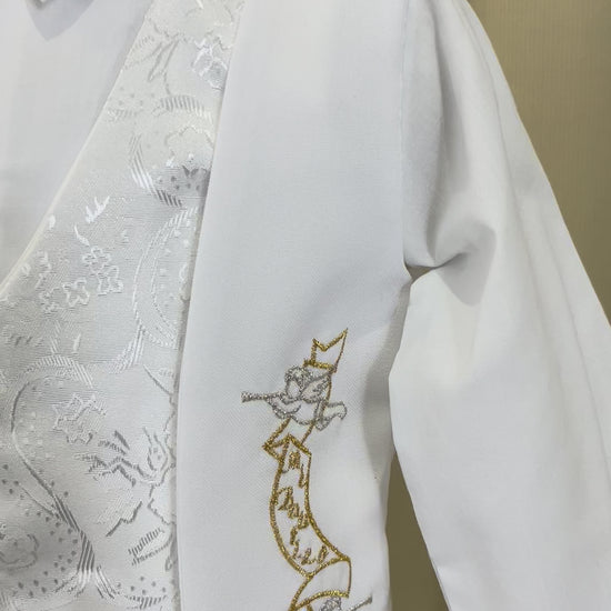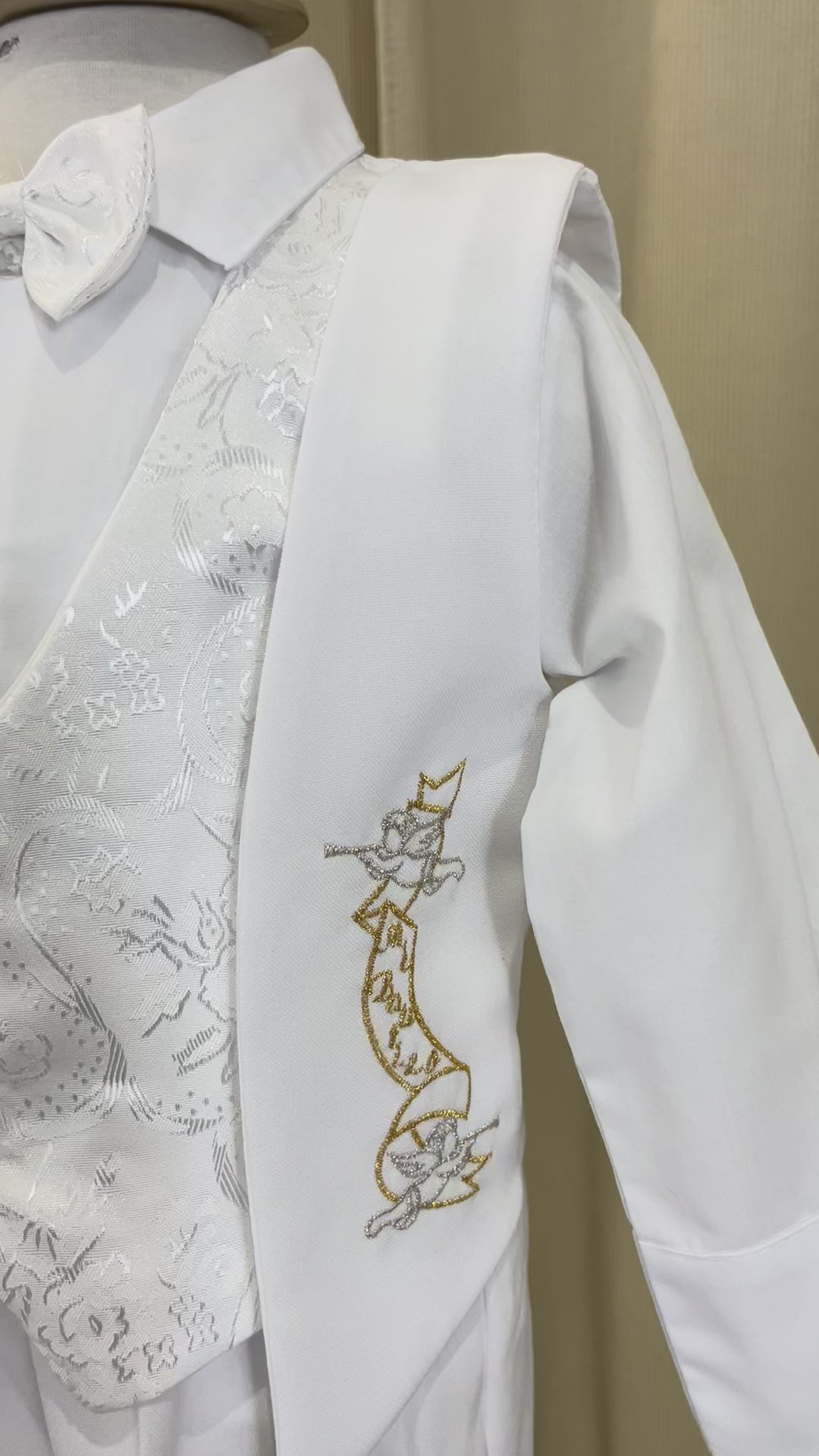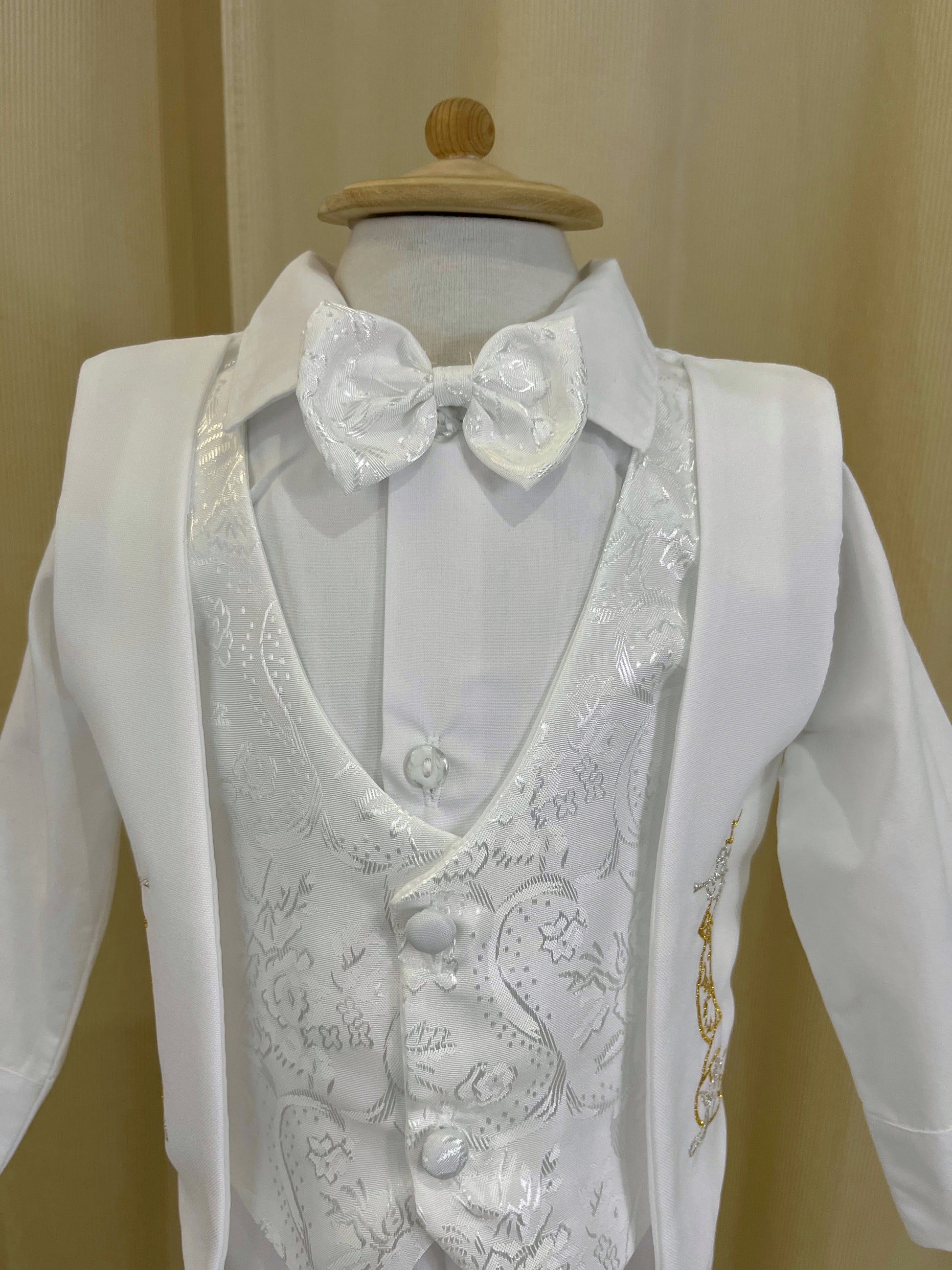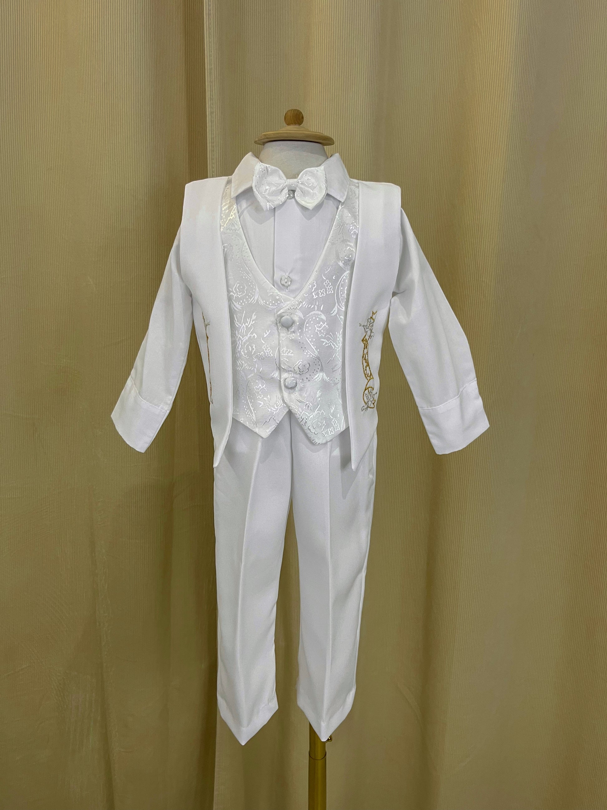Viste a tu pequeño con elegancia con nuestro traje con brocado que lo hace lucir elegante y sofisticado. El cual cuenta con 5 piezas las cuales incluyen: