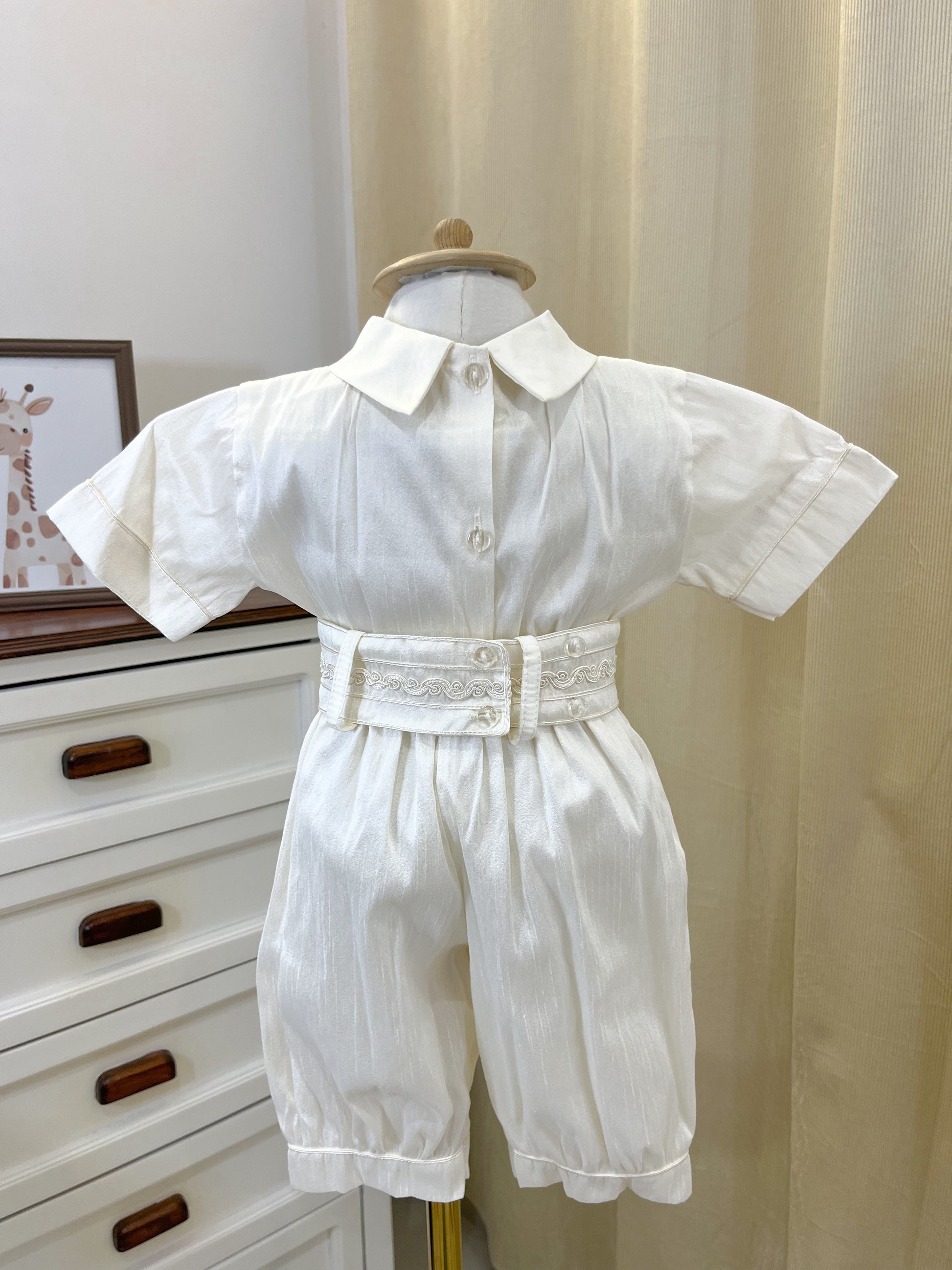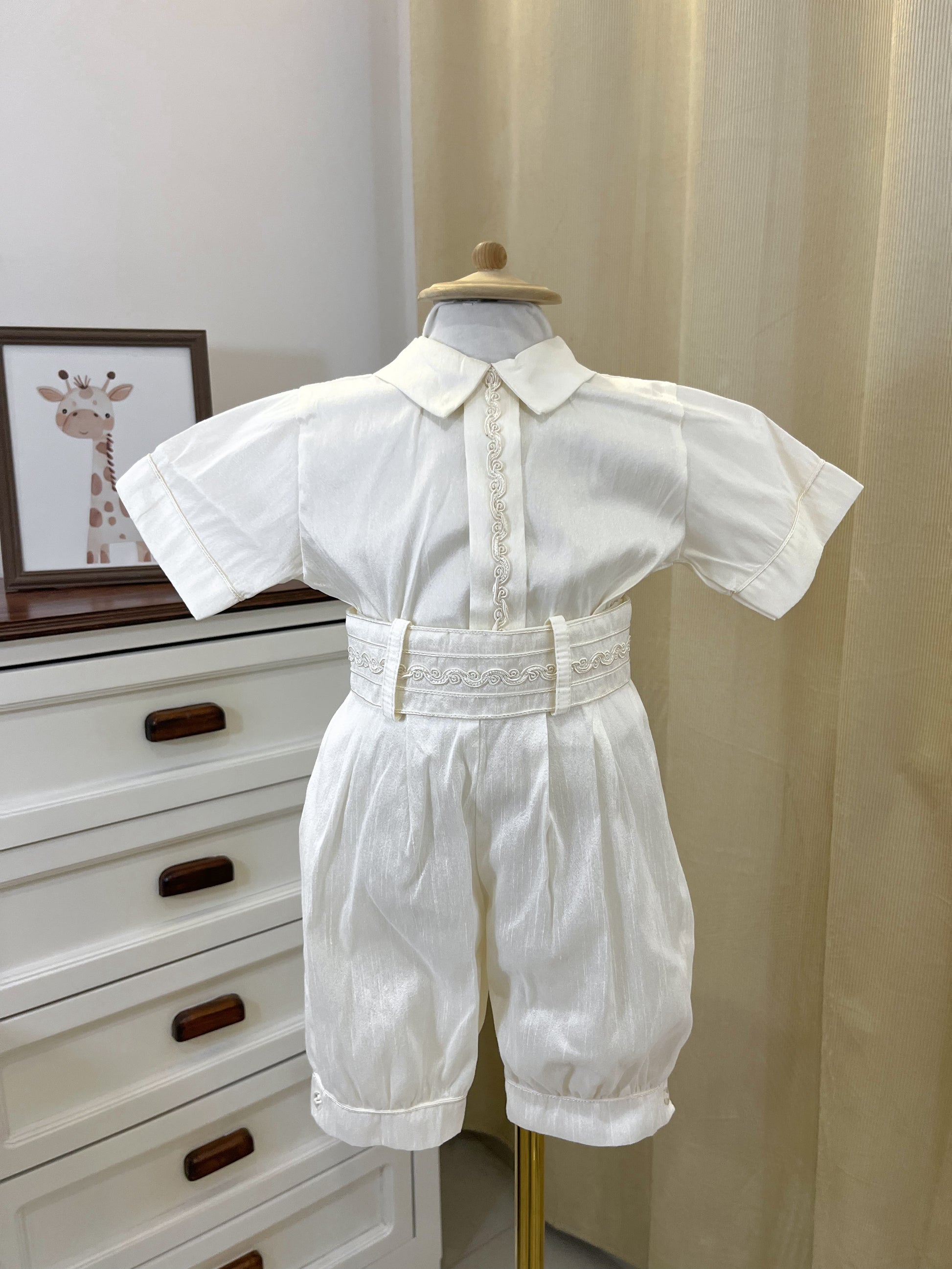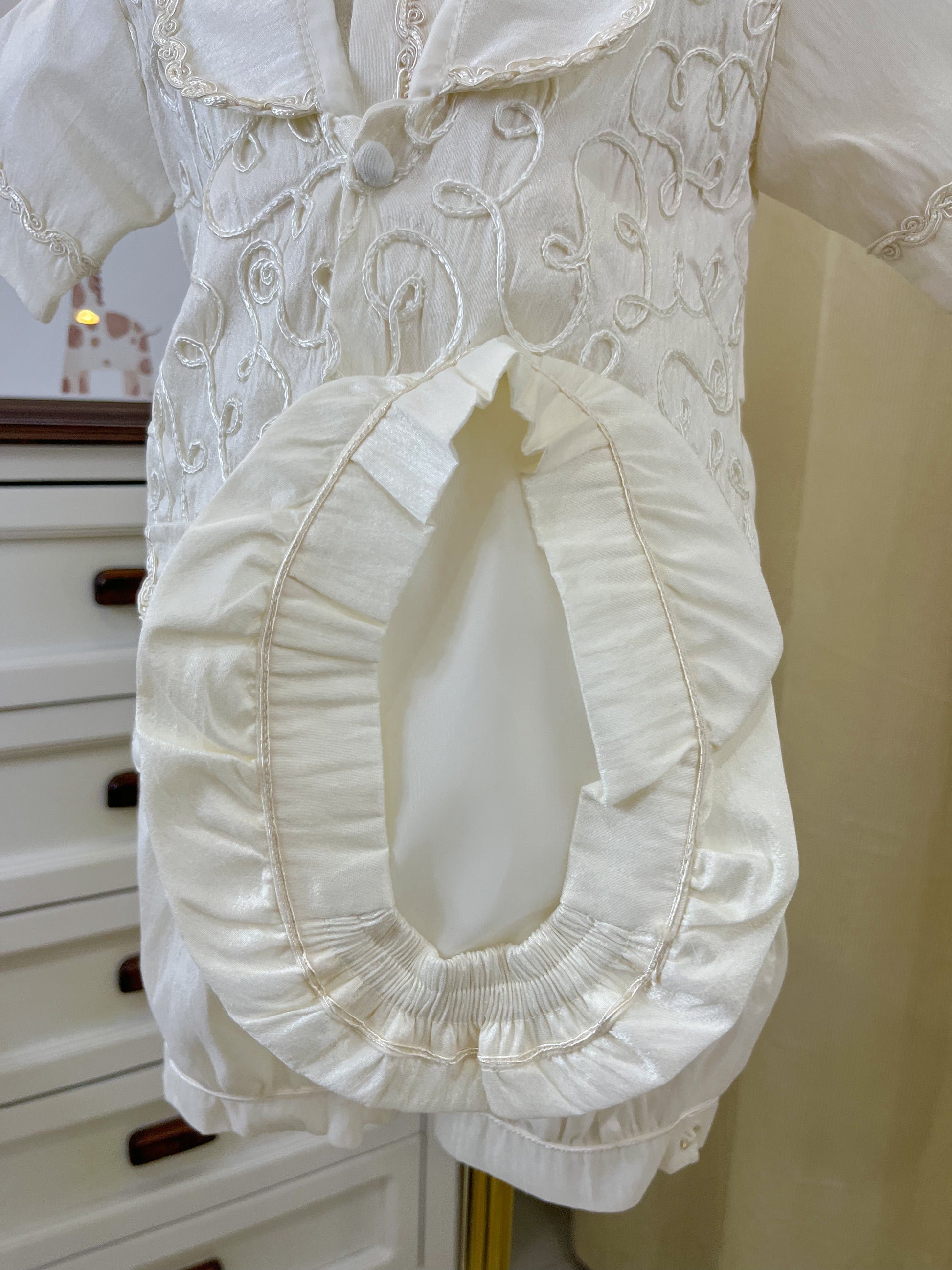 Ropon bombacho en tela perla con saquito confeccionado en shantung y gorro a juego. Diseño elegante y cómodo para el bautizo de tu bebé. Prenda completa que combina texturas delicadas con un acabado sofisticado, perfecta para momentos especiales.