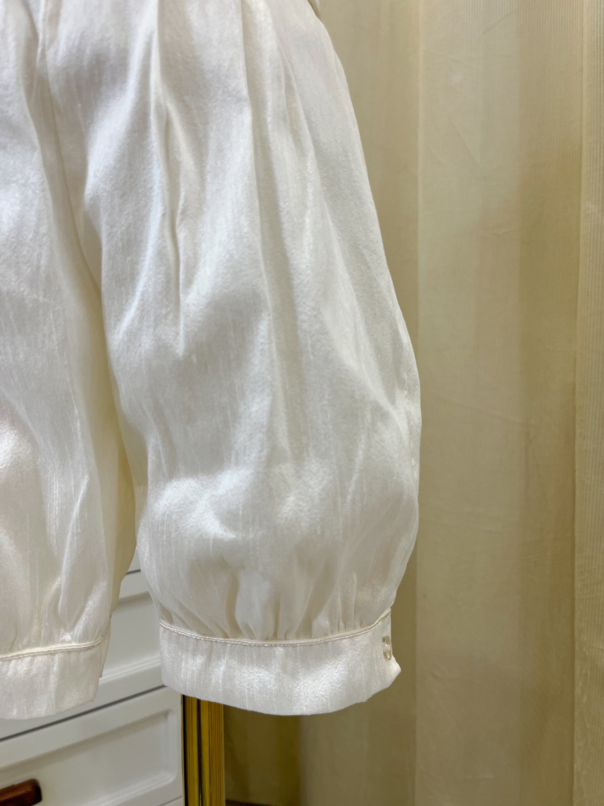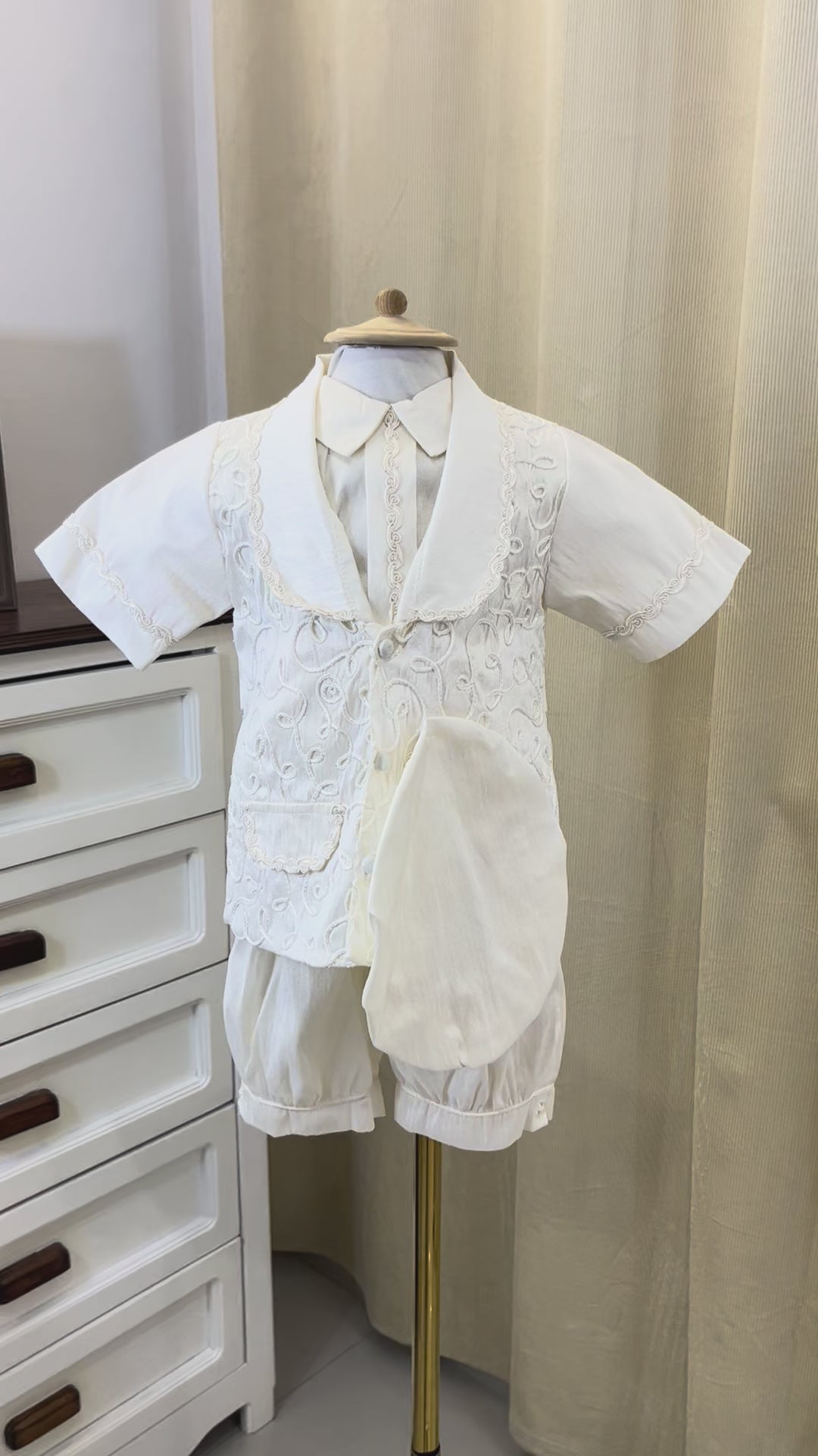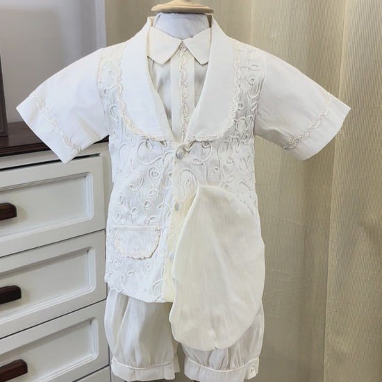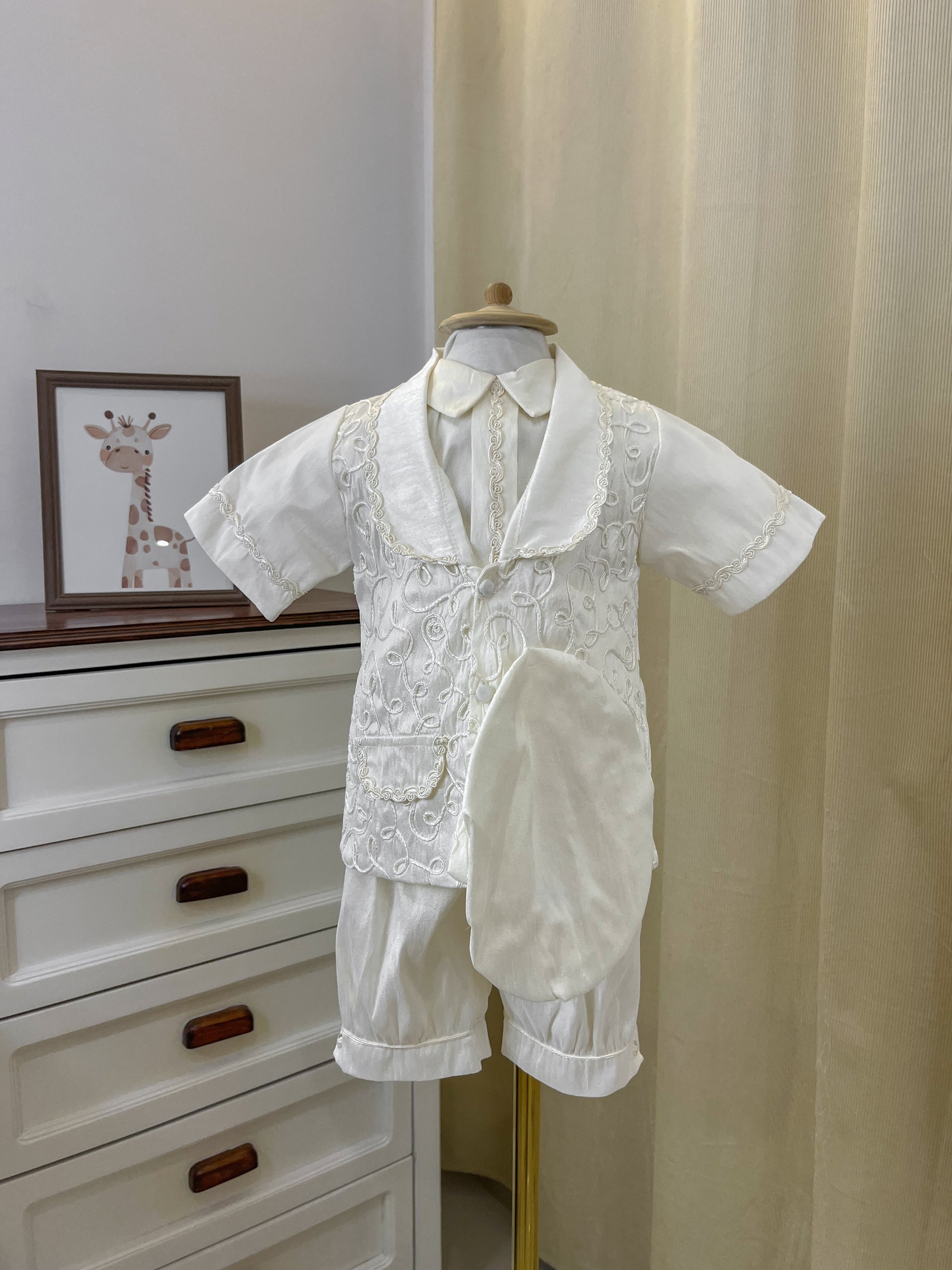 Ropon bombacho en tela perla con saquito confeccionado en shantung y gorro a juego. Diseño elegante y cómodo para el bautizo de tu bebé. Prenda completa que combina texturas delicadas con un acabado sofisticado, perfecta para momentos especiales.