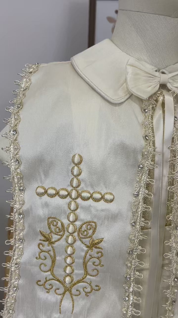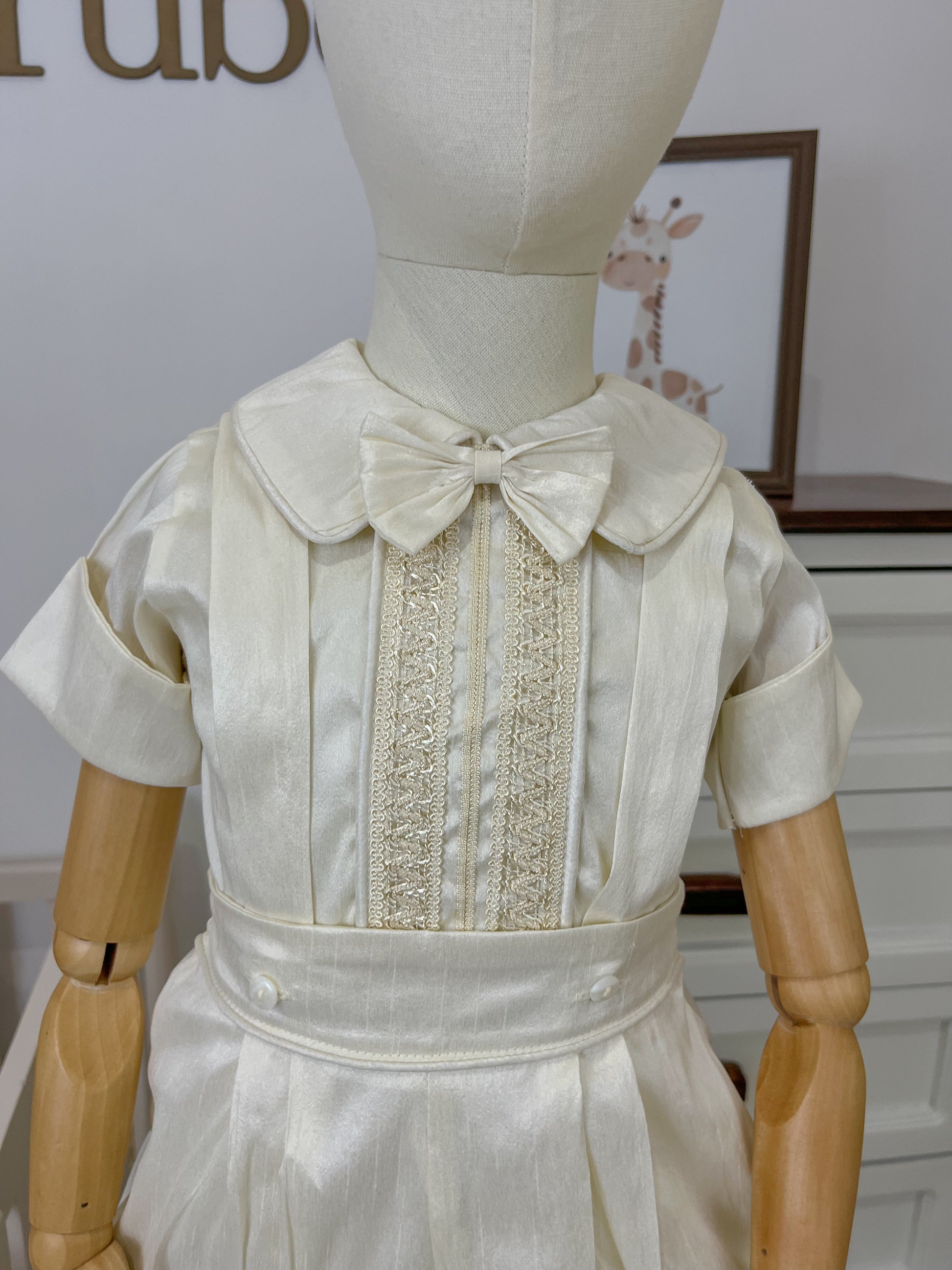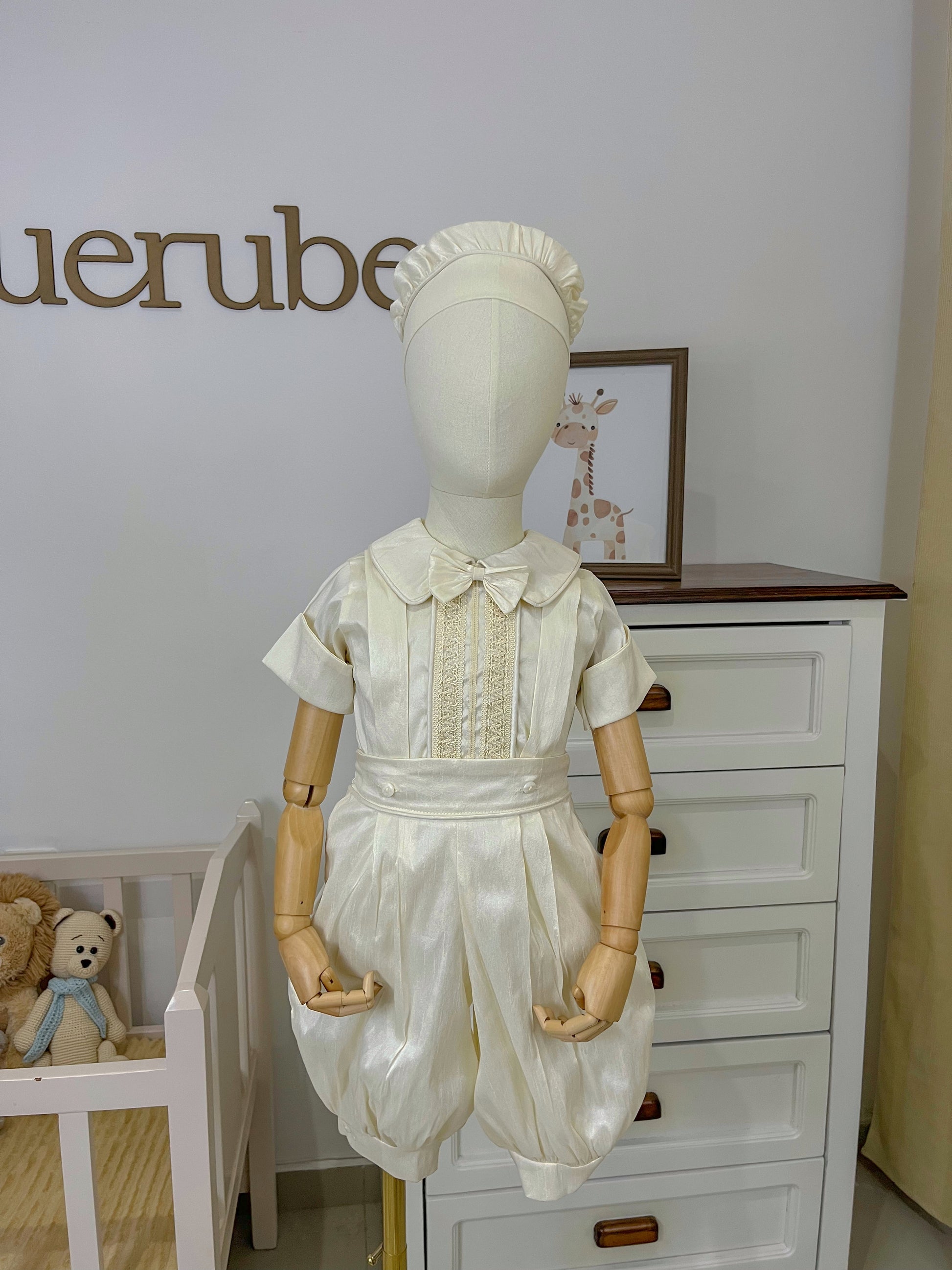 Ropón bombacho tradicional para bautizo, diseñado especialmente para niños y bebés. Este elegante traje presenta detalles dorados que le dan un toque sofisticado y ceremonial perfecto para momentos especiales.