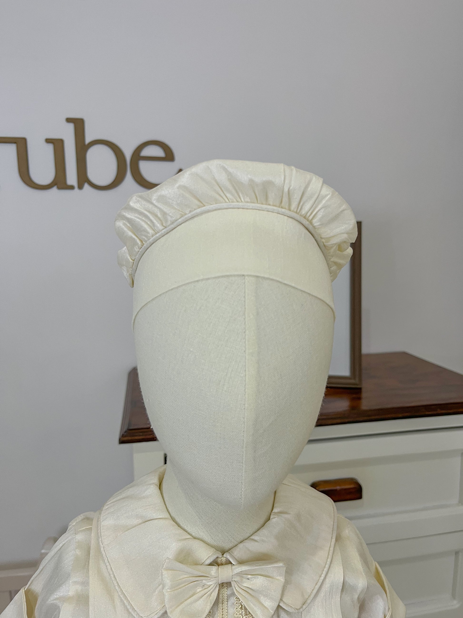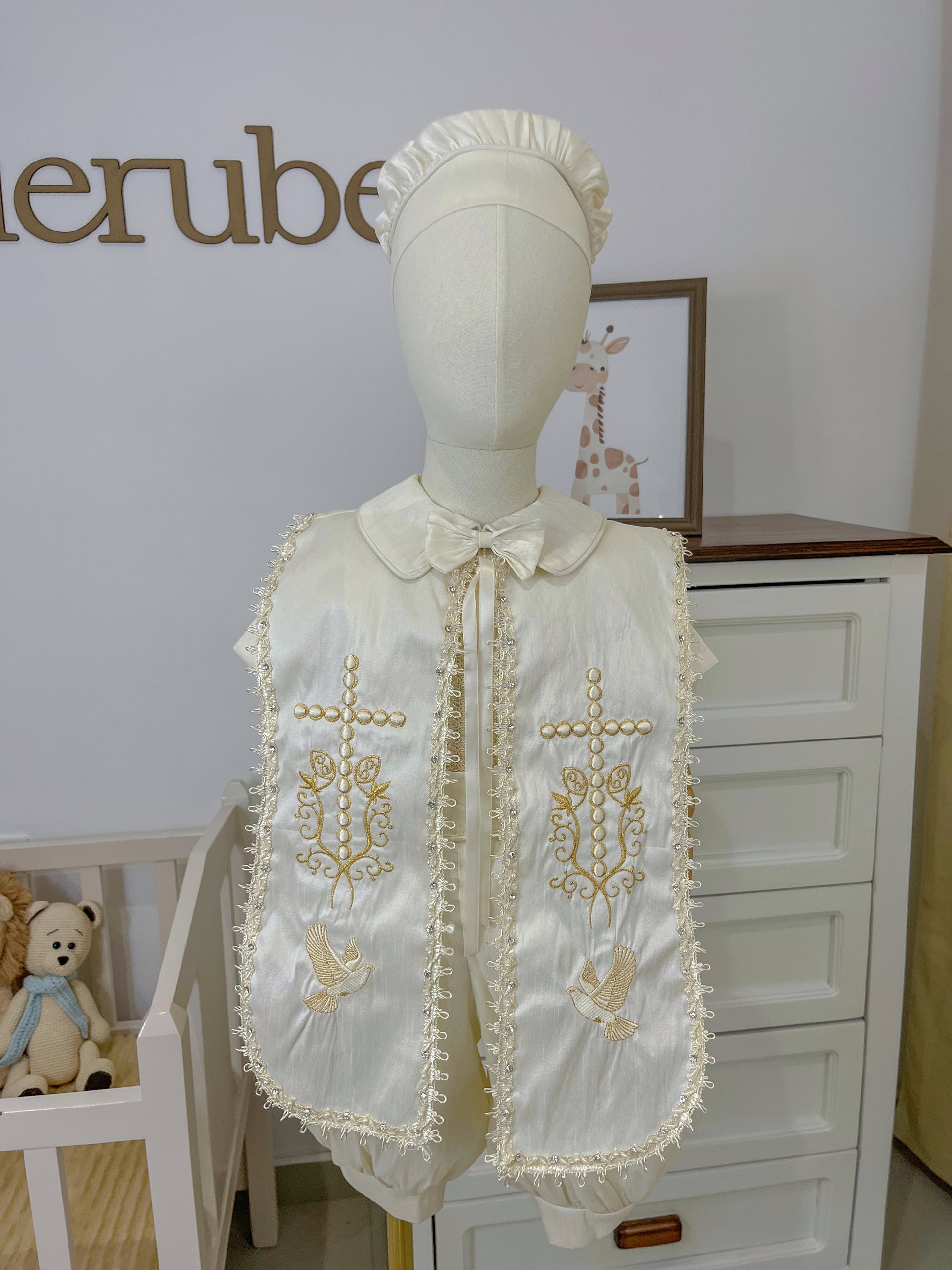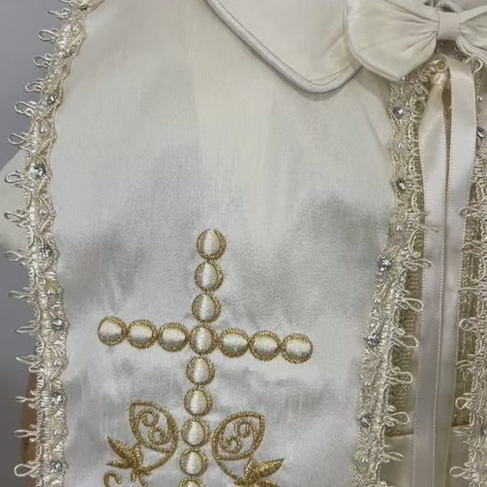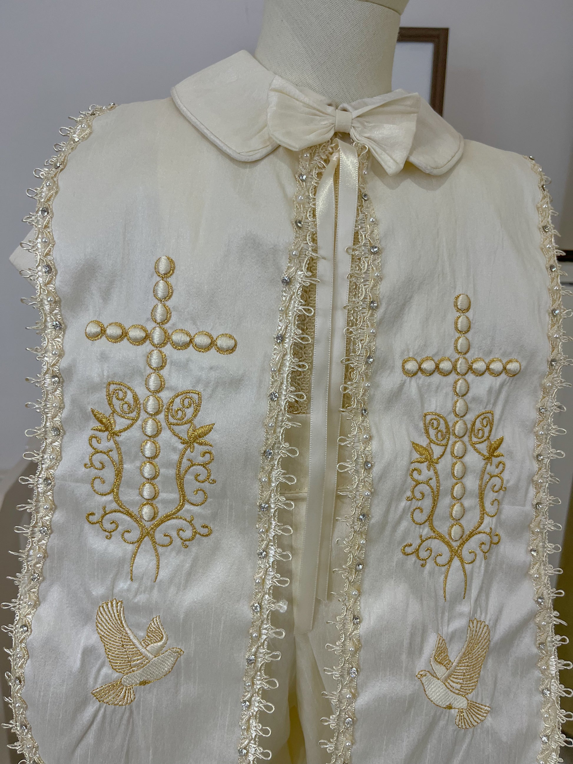 Ropón bombacho tradicional para bautizo, diseñado especialmente para niños y bebés. Este elegante traje presenta detalles dorados que le dan un toque sofisticado y ceremonial perfecto para momentos especiales.